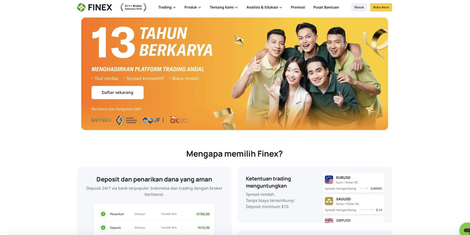 1. Finex – Pilihan terbaik secara keseluruhan untuk trading gold XAUUSD. Finex menjadi satu-satunya pialang berjangka dan broker yang terdaftar di Bappebti Indonesia dengan kualitas kelas dunia. Ini karena Finex adalah broker Gold spread rendah terbaik mulai 0,5 pips, deposit terkecil Rp100 ribu, tersedia lot mikro (0,01), dan dukungan platform MT5 serta aplikasi seluler (mobile app) canggih.
