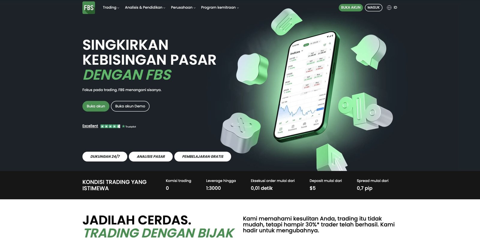 3. FBS – Opsi terbaik untuk pemula karena menawarkan kondisi trading yang menguntungkan. Ini termasuk deposit $5, spread tipis 0,7 pips, leverage tinggi, dan dukungan platform MT4 dan MT5 serta FBS Trader.