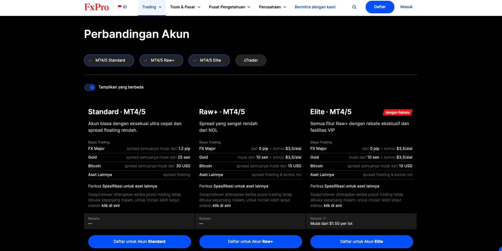 - Akun Elite: zero spread untuk FX major, komisi $3,5/sisi